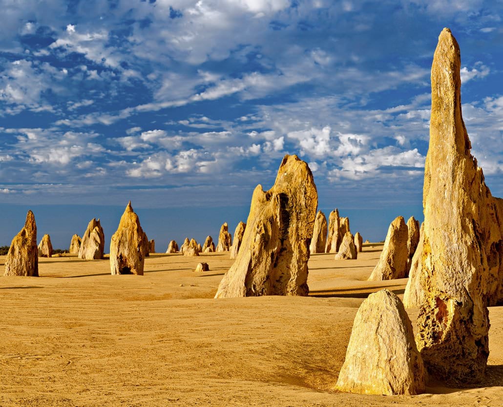 We visit Mount Scott for an overview of Geraldton and Grey’s Bay, and its memorial for victims of the warship HMAS Sydney II, sunk off the coast. We then visit the architecturally unique St. Francis Xavier Cathedral in the city center. Heading south along the coast via Leeman and Jurien Bay, we reach Cervantes, gateway to Nambung National Park. The Pinnacles are one of Western Australia’s most visited natural wonders — thousands of bizarre limestone pillars up to 5 meters high in a surreal desert landscape. A walk among them offers stunning photo opportunities. We continue via Lancelin to Perth, where this extraordinary journey ends at your hotel.