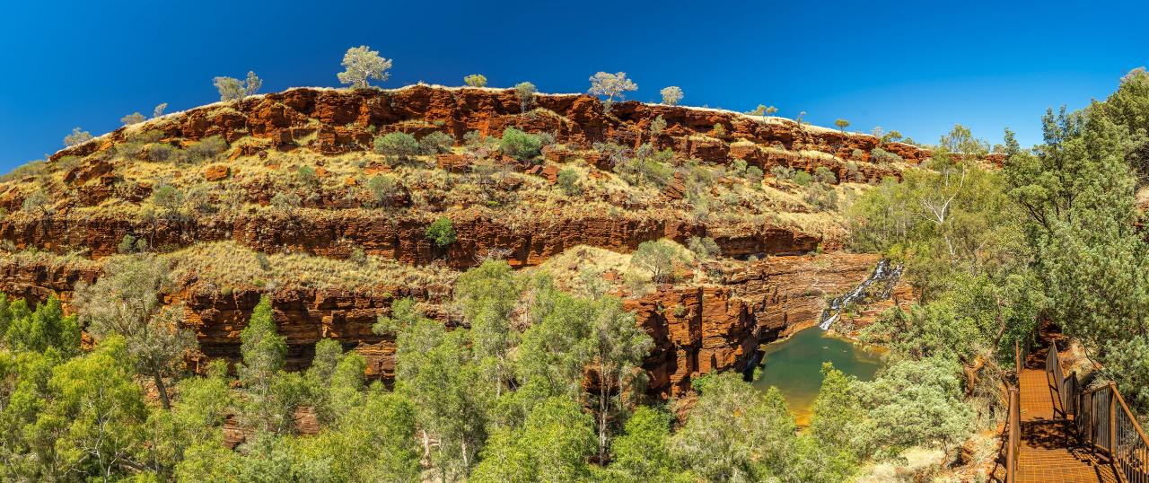 The rocks in Western Australia’s second-largest national park are among the oldest on Earth, with some of the most vibrant and dramatic landscapes in the country. The iron-rich highlands are filled with gorges, permanent waterholes, and spectacular viewpoints. We hike to Fortescue Falls and Fern Pool, whose year-round pools are perfect for a swim. We also visit Oxer Lookout for an amazing view over four merging gorges.