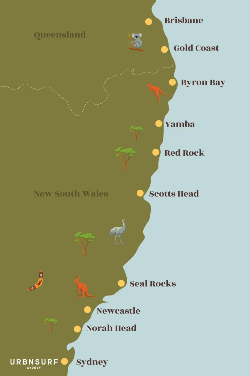 Brisbane and Sydney, visiting the best surf spots and campsites, specifically