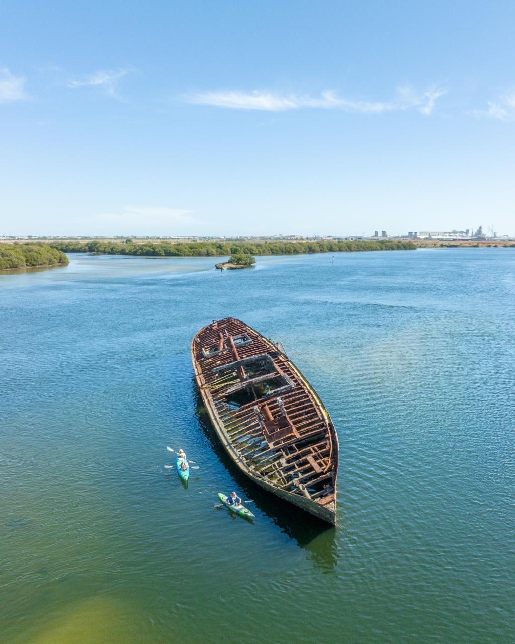 The Kayak Tour is up to three hours of fun exploring the Dolphin Sanctuary and Ships Graveyard Maritime Heritage Trail. One of Adelaide’s “secret spots” the tour is located just 30 minutes from the Adelaide CBD and is an area of surpassing beauty. The sheltered mangrove lined creeks are home to a fascinating array of marine life, birds and the Port River Dolphins. The Ship’s Graveyard is a unique feature of the area with spectacular relics from the past which have been abandoned in the river.