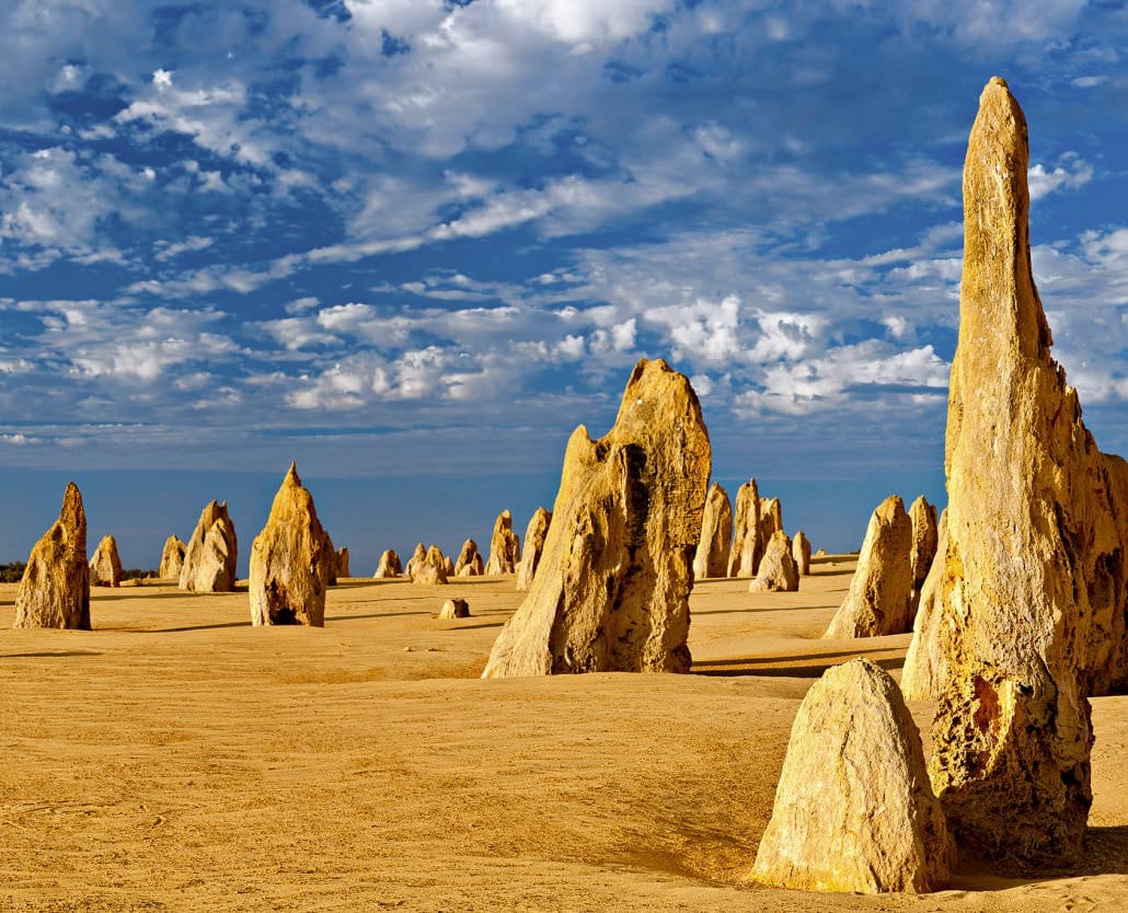 After pick up from your hotel we are leaving Perth headed north along the coast towards Cervantes, the entrance to Nambung National Park. The Pinnacles are among the most visited natural wonders of the state. Thousands of limestone pillars rise out of a stark landscape of yellow sand. There is ample time to explore the area and to take some colourful photos from these amazing formations. These impressions of lights and colours will stay with you for many years to come. We head north along the coast via Jurien Bay and Leeman towards Geraldton, the sunniest town in W.A. A visit to Mount Scott gives you the opportunity of an outlook over the town of Geraldton and Grey’s Bay. Here is also the memorial for the victims of the sunken warship HMAS Sydney II. Our sightseeing tour concludes with a visit to the architecturally interesting St. Francis Xavier Cathedral in the town centre.